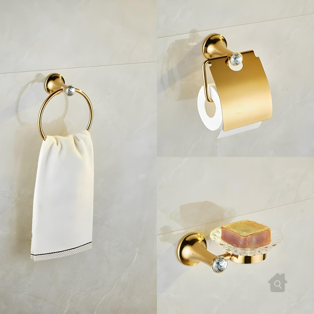 Transforme seu banheiro com o luxo atemporal da coleção Palacium, assinada pela Homedeccori. Este conjunto de acessórios combina o brilho do aço inoxidável dourado polido com detalhes refinados em cristal lapidado, criando uma atmosfera de elegância e exclusividade.