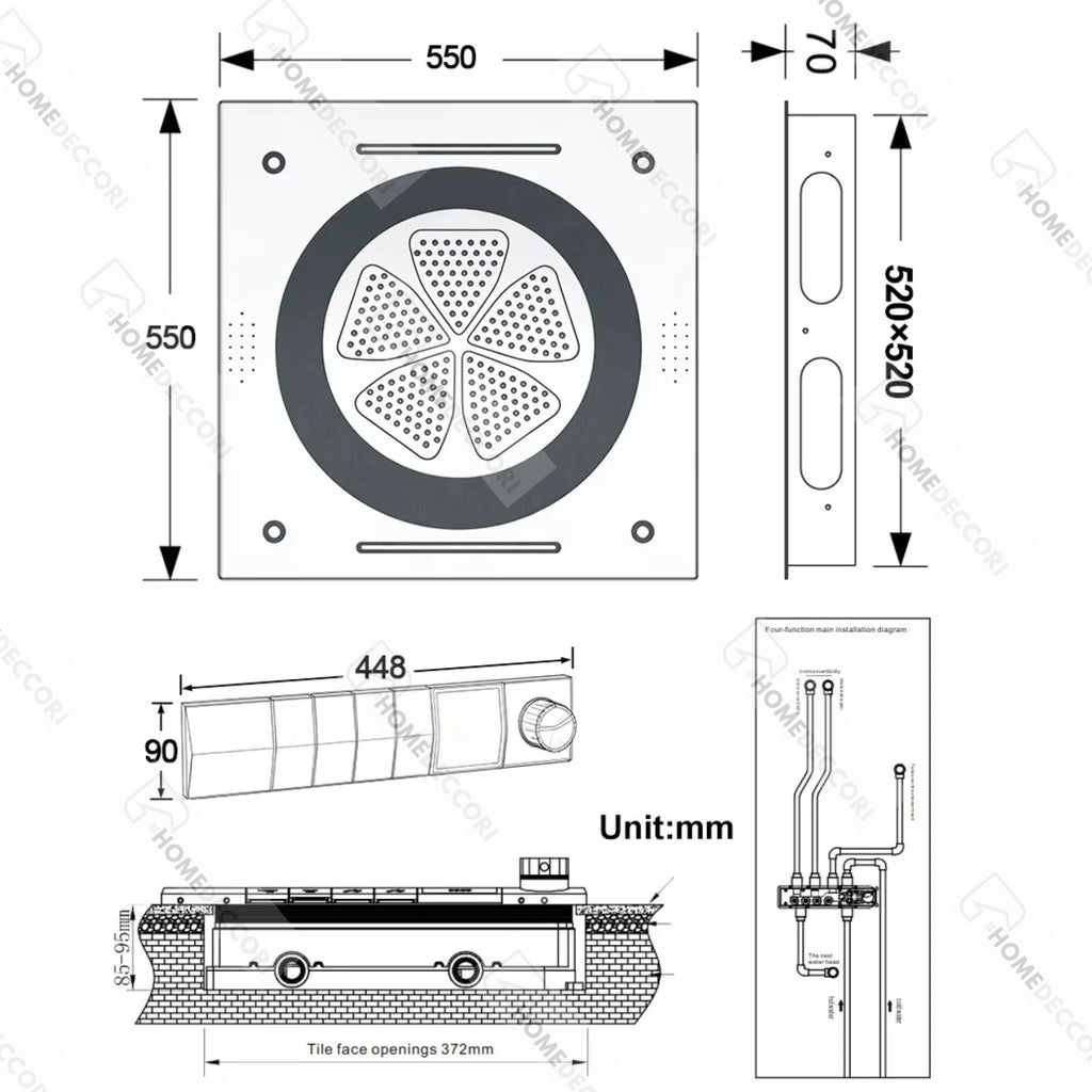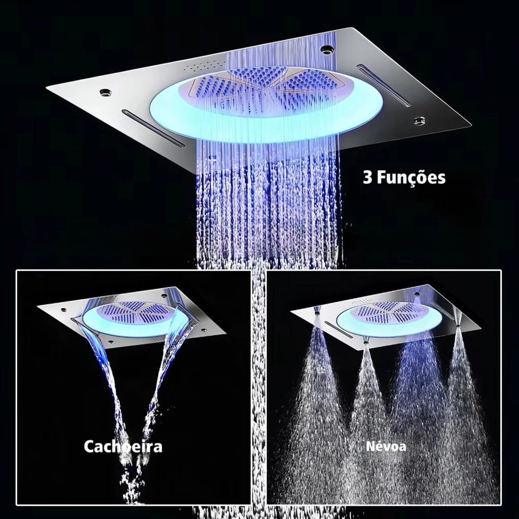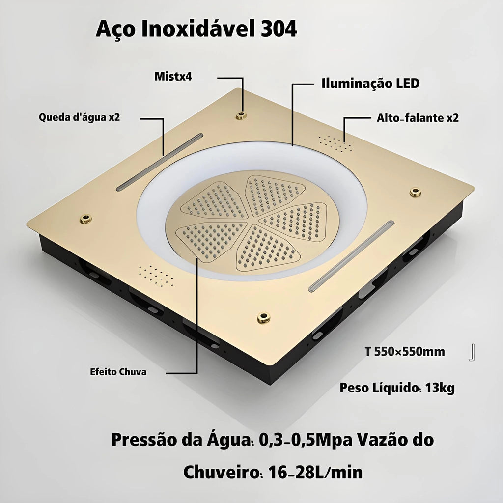 Com instalação embutida no teto, seu formato quadrado de 55x55 cm garante ampla cobertura de água, criando um efeito de chuva intensa e uniforme. O conjunto integra múltiplas funções de jato, permitindo personalizar o banho conforme a preferência do usuário.
