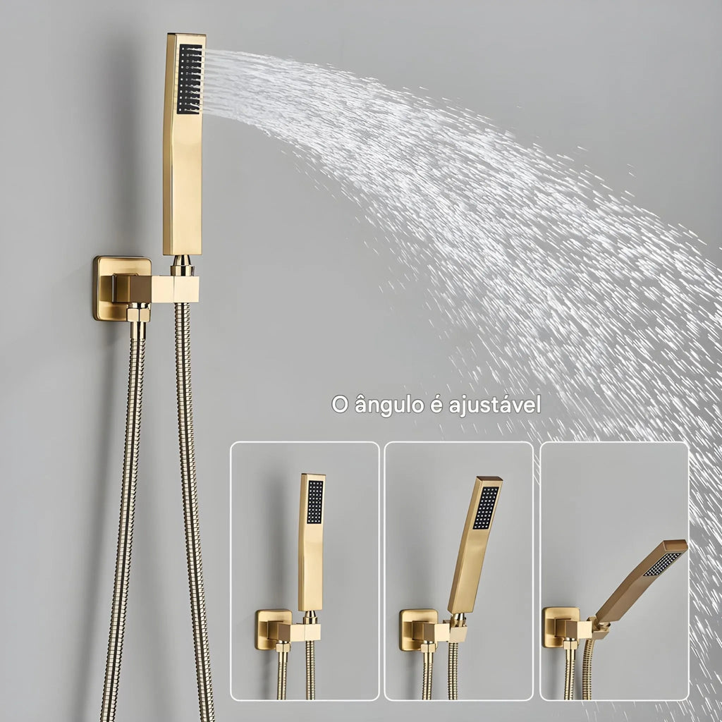 Ducha manual em inox, com design reto, jatos concentrados e ângulo ajustável para maior praticidade no uso diário.