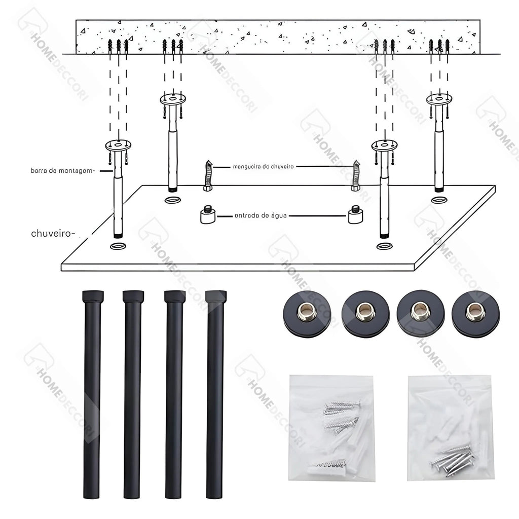 A ducha é projetada para instalação no teto, com estrutura robusta e braços reforçados que garantem fixação segura e estabilidade do conjunto. A altura de instalação é ajustável, permitindo adaptação a diferentes projetos de banheiro.