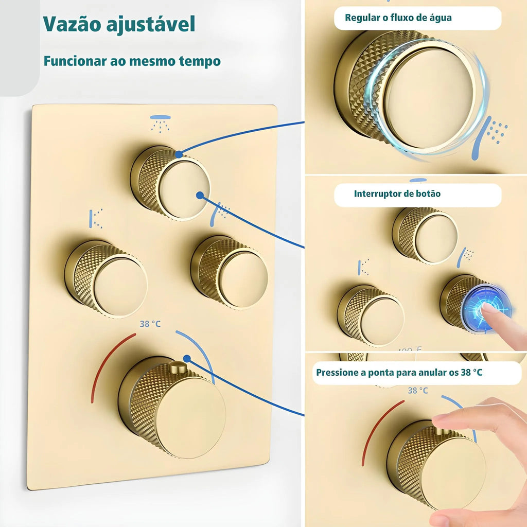 Banho de spa com controle total: ducha de teto 40x40 cm (16”) com modo chuva + modo névoa, além de ducha manual de alta pressão. As saídas podem ser usadas simultaneamente, com vazão ajustável por comando e termostato com trava de segurança em 38°C para mais conforto e proteção no dia a dia.