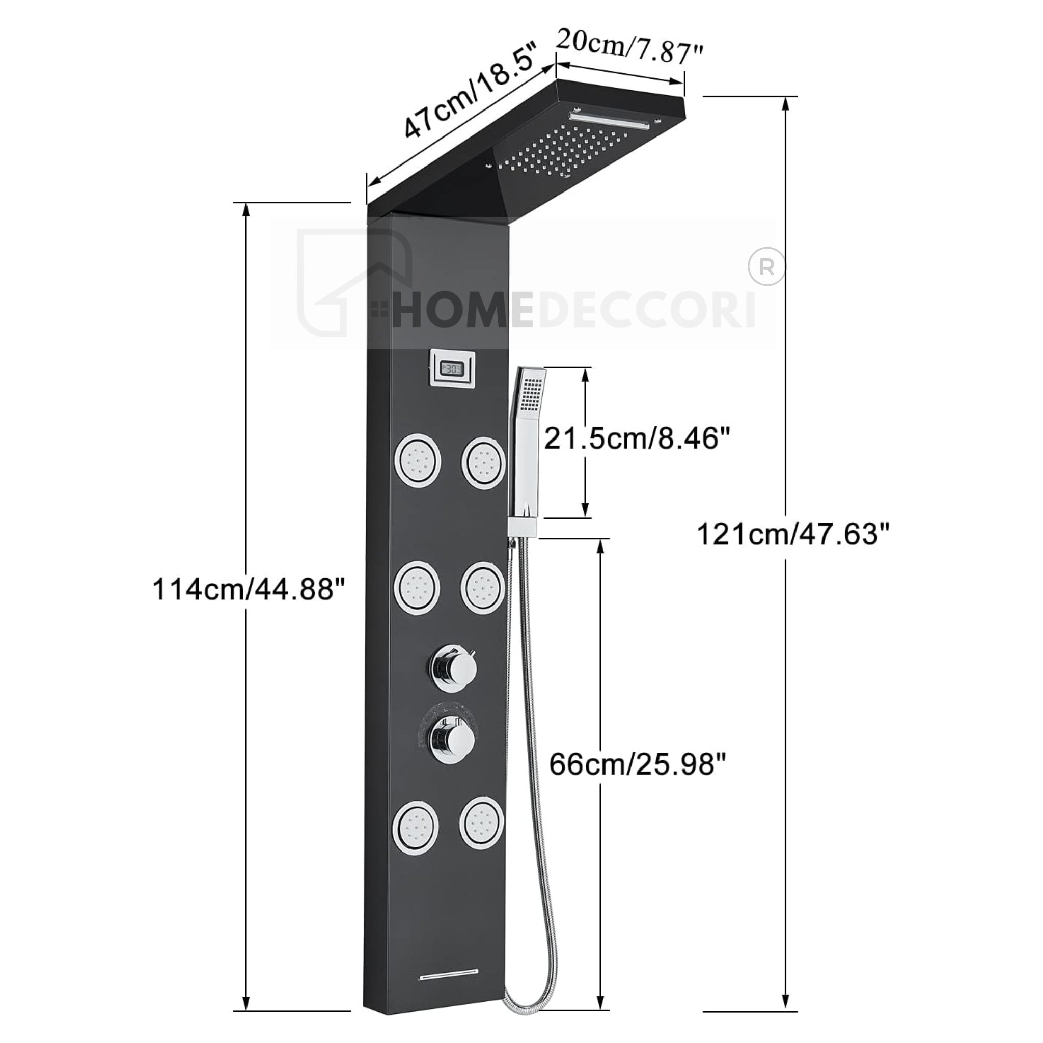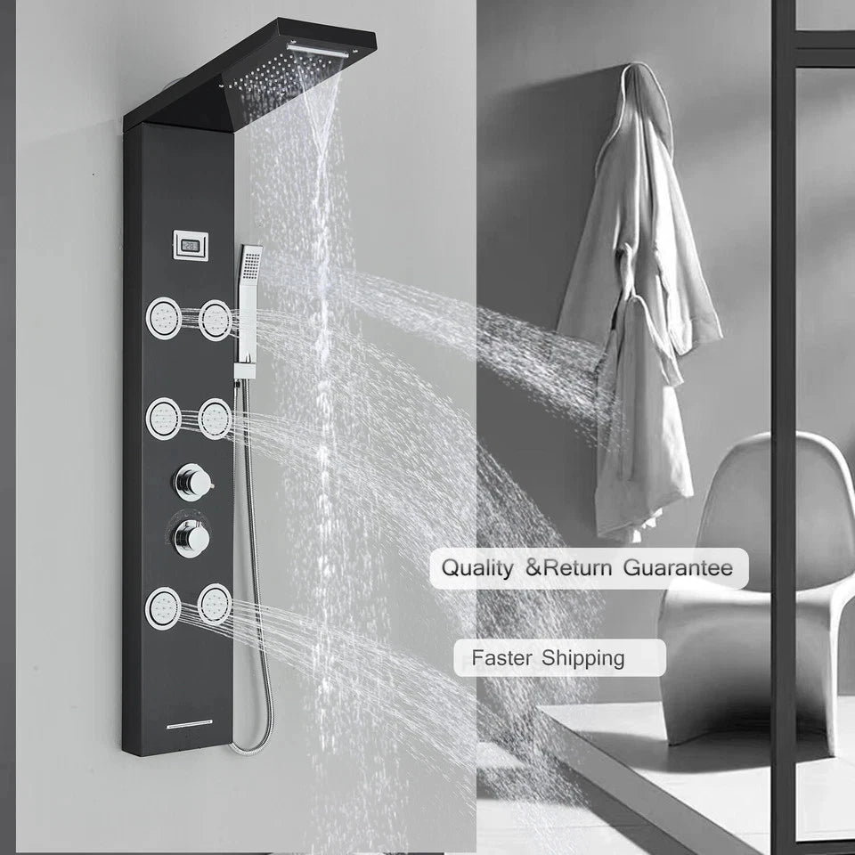 O painel retangular de linhas limpas abriga 6 jatos frontais de hidromassagem, chuveiro tipo chuva, cascata waterfall e visor de temperatura analógico, criando uma experiência visual relaxante e envolvente digna de um spa de alto padrão. Seu design moderno harmoniza perfeitamente com banheiros de luxo, suítes master e espaços de banho integrados, elevando o nível estético do ambiente.