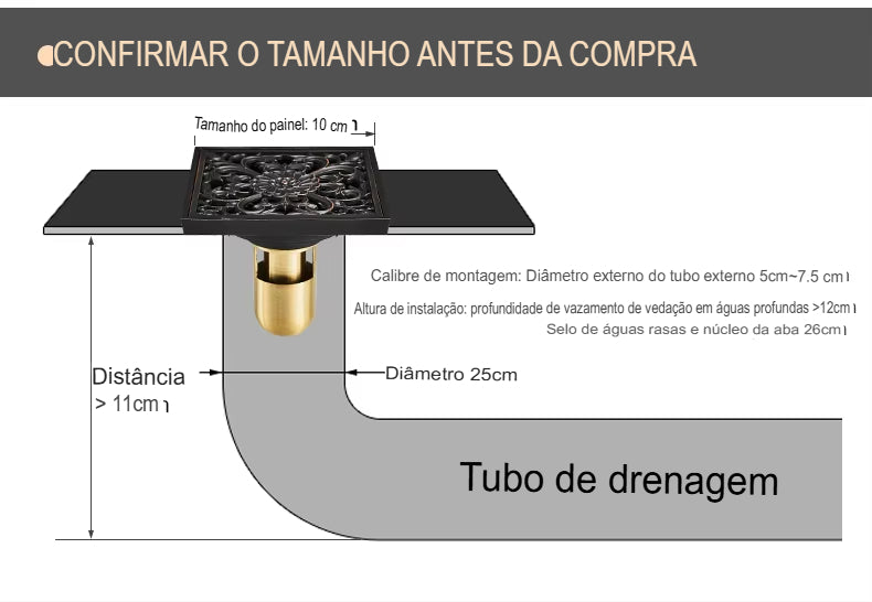 Fabricado em latão maciço com pintura eletrostática tripla, o ralo oferece acabamento premium nas cores preto fosco, dourado e bronze antigo, garantindo um toque de luxo atemporal para banheiros sofisticados, áreas gourmet e lavabos de alto padrão.